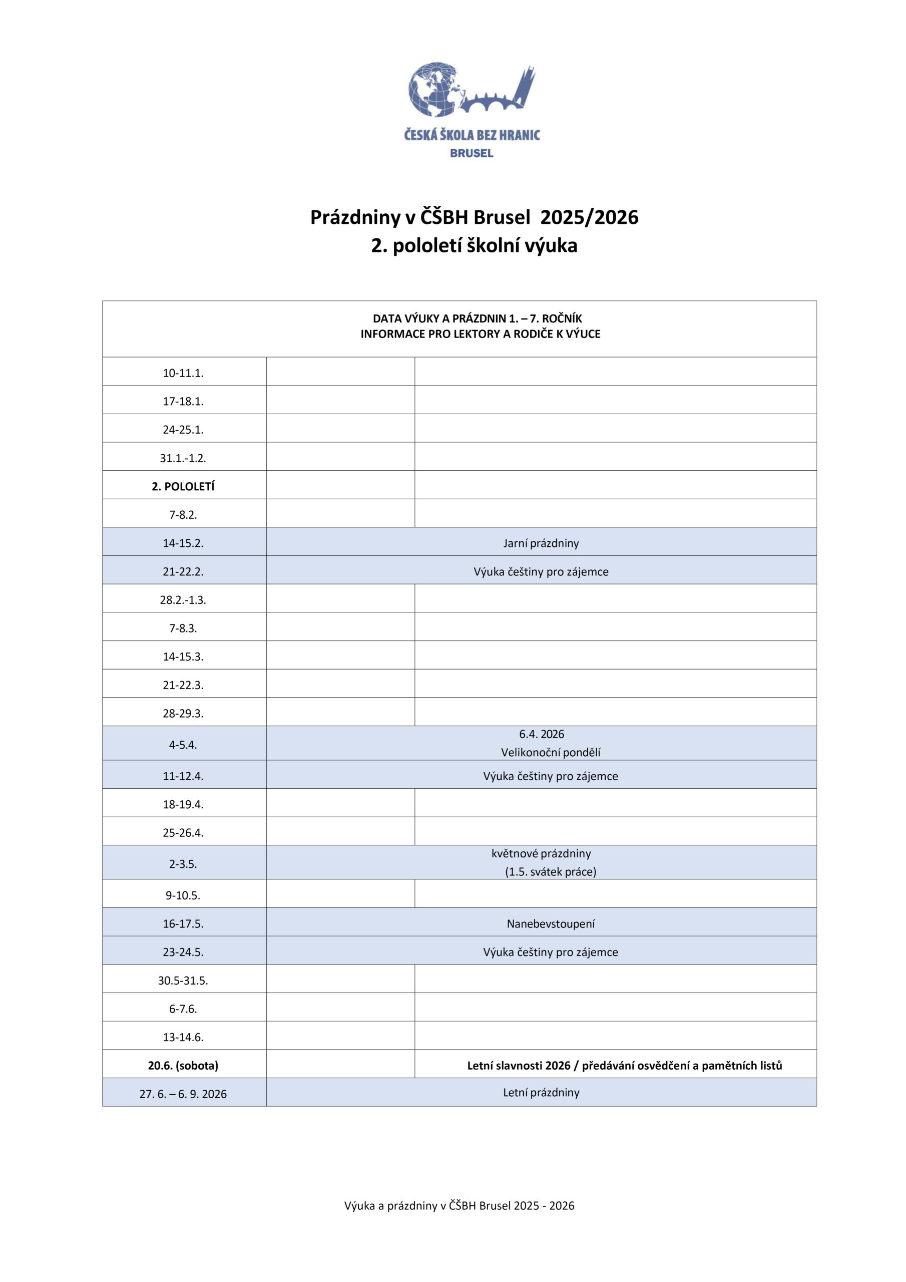 pololetí 2025-2026 – výuka školní žáci ČŠBH Brusel