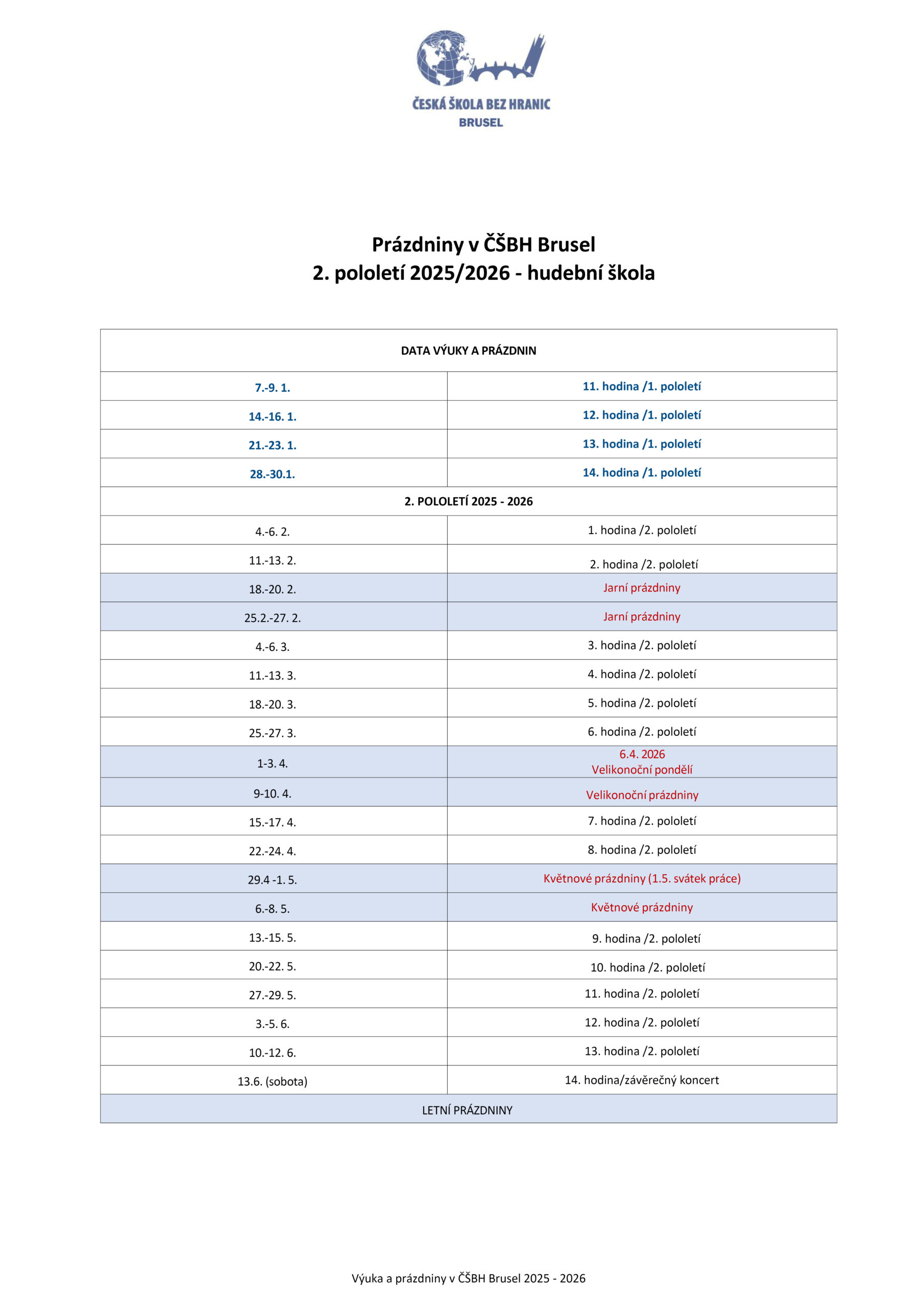 pololetí 2025-2026 – hudební škola ČŠBH Brusel